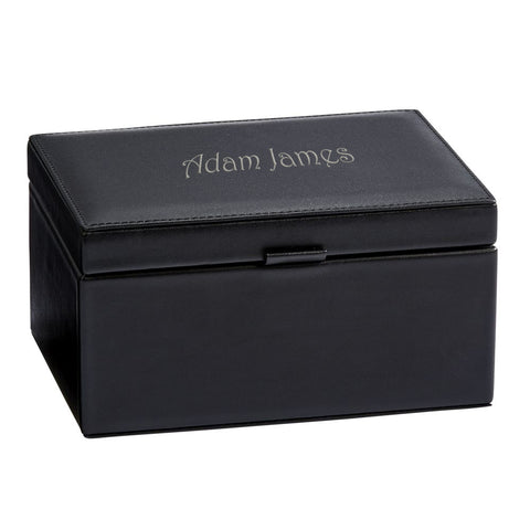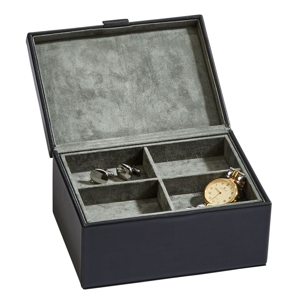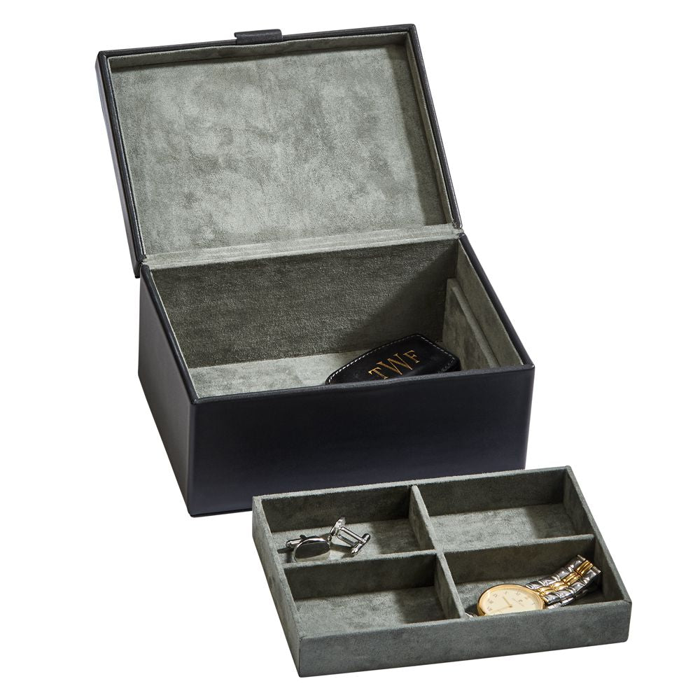Made from genuine top grain leather this 7" x 5" x 3.75" black leather box features a grey velveteen lining throughout. Lift out the 4-section tray inside to reveal more storage in the compartment below. The lid even features a handy leather pull tab for easy opening. Personalization available.